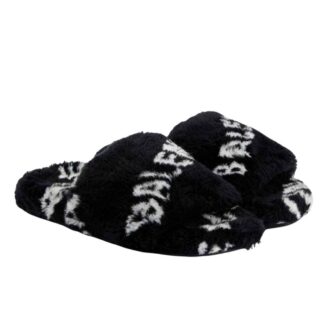 Balenciaga Furry Logo Slides – Statement luxury footwear featuring a plush black faux-fur construction and an all-over white Balenciaga logo pattern.