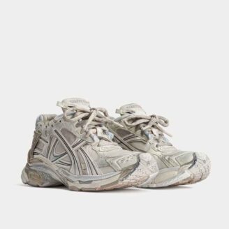 Balenciaga Runner Low Top Sneakers – Deconstructed beige athletic-style sneakers featuring a layered mesh and nylon upper with a signature worn-out, distressed finish.