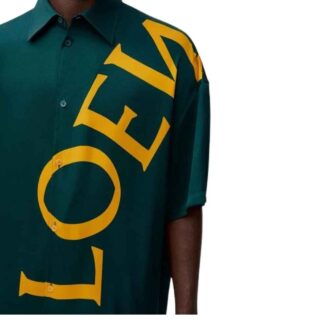 Loewe Large Logo Bowling Shirt – A premium forest green cotton essential featuring oversized yellow typographic branding and a relaxed camp collar.