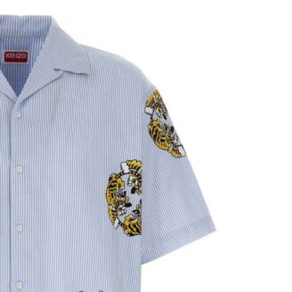 Kenzo Tiger Crest Striped Silk Shirt – A premium silk-blend essential featuring a classic blue stripe pattern and iconic tiger crest embroidery for an elevated luxury look.