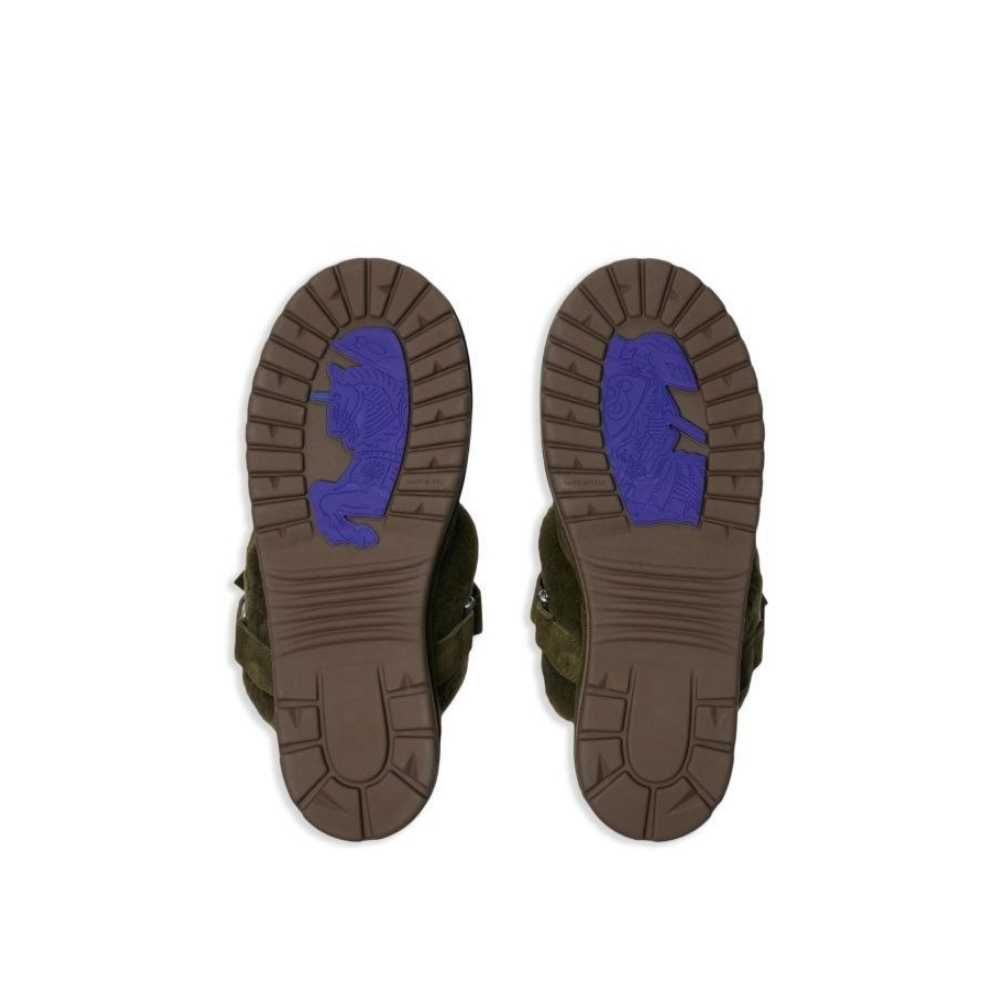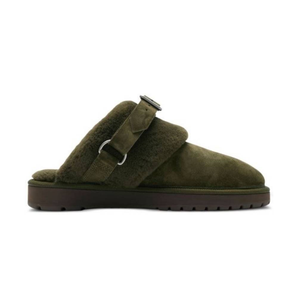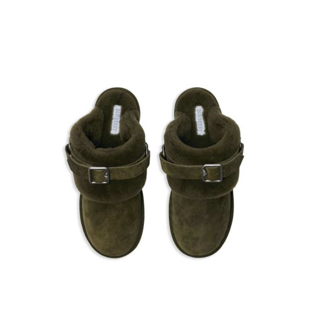 Burberry Shearling Buckle Slippers – A luxury sheepskin essential featuring plush olive green suede and adjustable buckle straps for a definitive comfort statement.