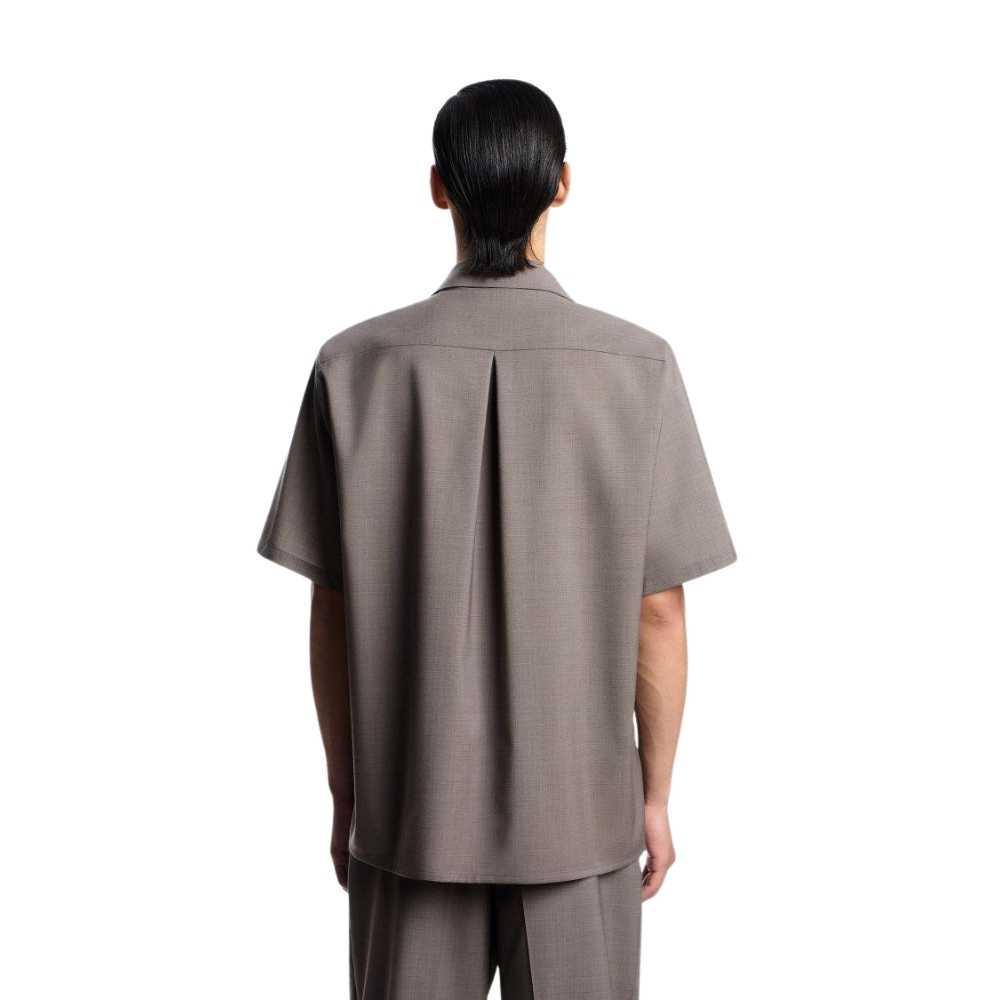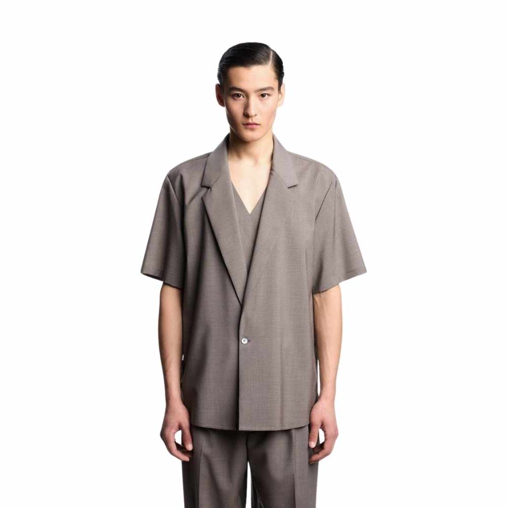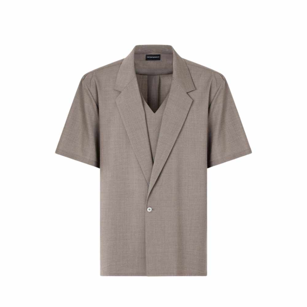Emporio Armani Hybrid Blazer Shirt – A sophisticated taupe garment featuring an innovative integrated layered design and a sharp blazer-inspired silhouette.