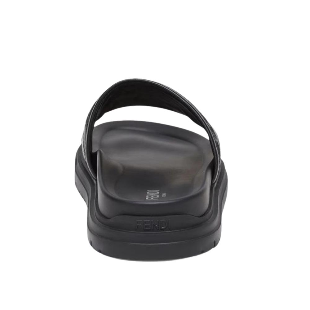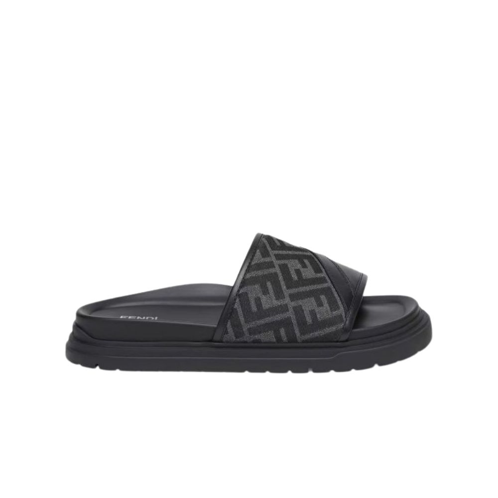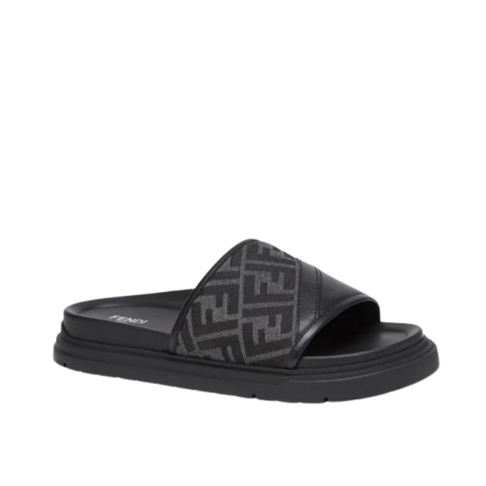 These luxury slides are meticulously crafted with a sophisticated dual-material construction, combining smooth premium leather with iconic FF logo jacquard fabric. The asymmetric strap design features tonal “FF” monogramming in a refined charcoal and black palette, offering instant brand recognition through a modern, textured aesthetic. A contoured black footbed is engineered to provide anatomical support and exceptional comfort, while the prominent “FENDI ROMA” branding on the heel serves as a hallmark of Italian excellence. The robust tonal rubber outsole features a tiered edge for a contemporary silhouette and reliable traction. This essential footwear piece seamlessly blends streetwear influence with high-fashion craftsmanship, making it a versatile choice for upscale leisure or urban environments.