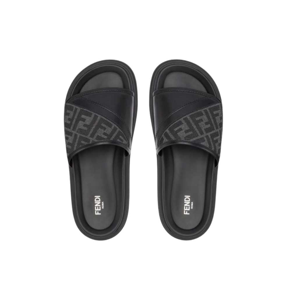 Fendi FF Fabric & Leather Slides – Sophisticated black slides featuring asymmetric straps in signature FF jacquard and a comfortable contoured footbed.