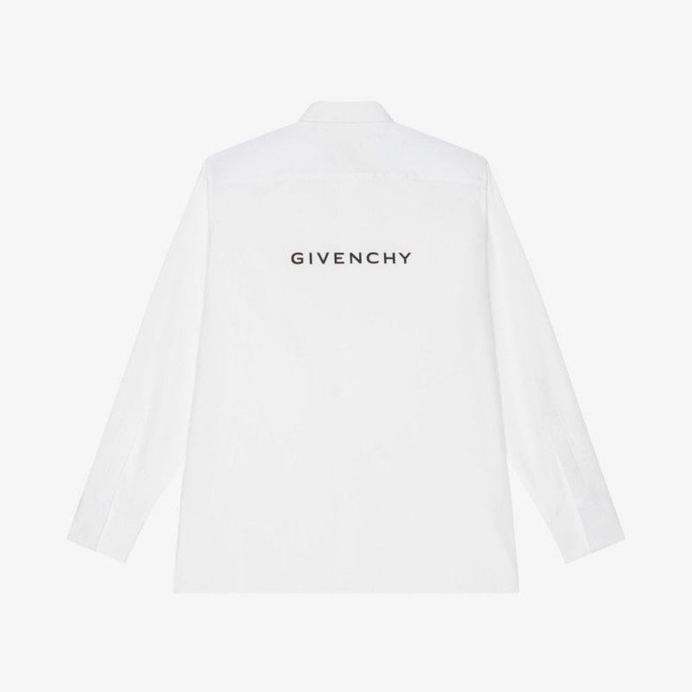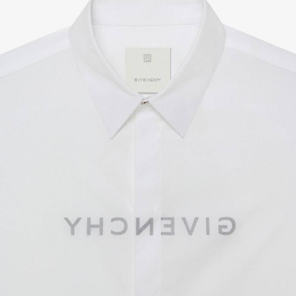 This modern shirt is crafted from premium structured cotton poplin, offering a crisp, lightweight feel and a sharp aesthetic. It features the innovative Reverse logo, showcasing an inverted Givenchy signature printed or embroidered across the back or chest. The design is tailored with a minimalist point collar and a clean button placket for a streamlined, high-fashion silhouette. Finished with precision-engineered cuffs, this versatile piece blends traditional Parisian craftsmanship with contemporary streetwear sensibilities.
