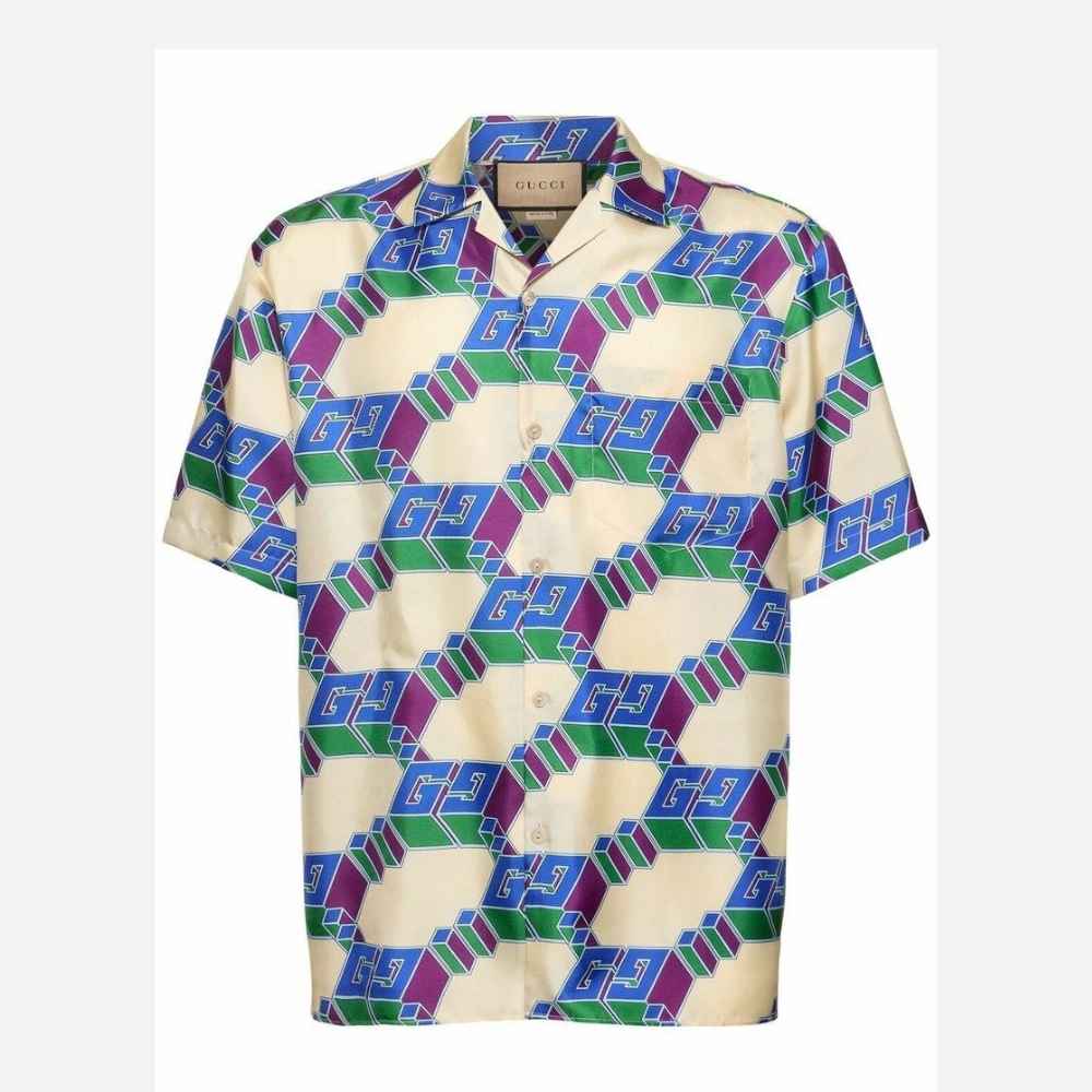 Gucci 3D GG Print Silk Shirt – Italian-made silk shirt featuring the bold three-dimensional GG pattern in a refined, fluid silhouette.