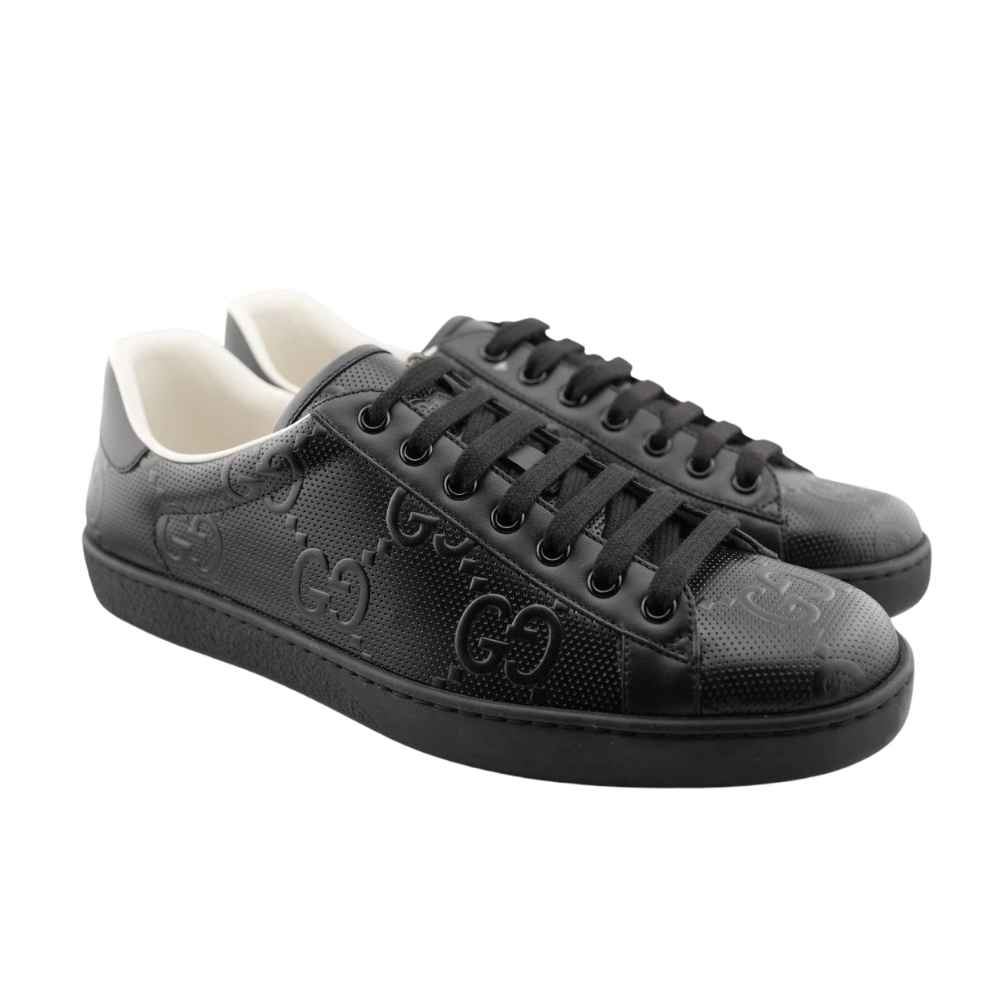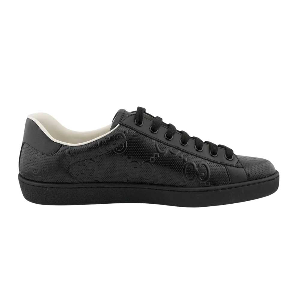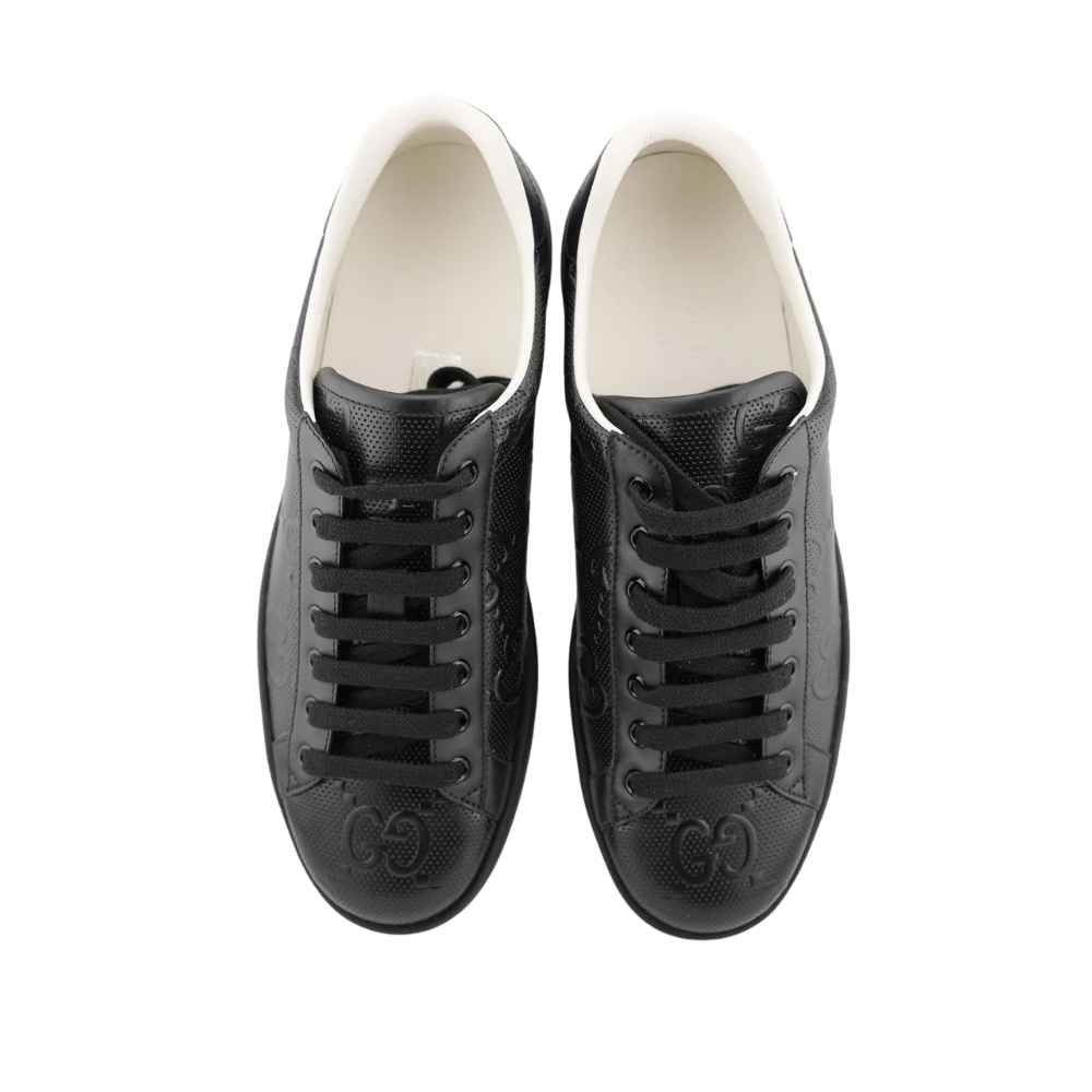 Gucci Ace Perforated GG Sneakers – A premium leather essential featuring an all-black perforated design and contrasting white lining for a definitive luxury athletic statement.