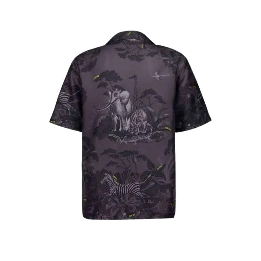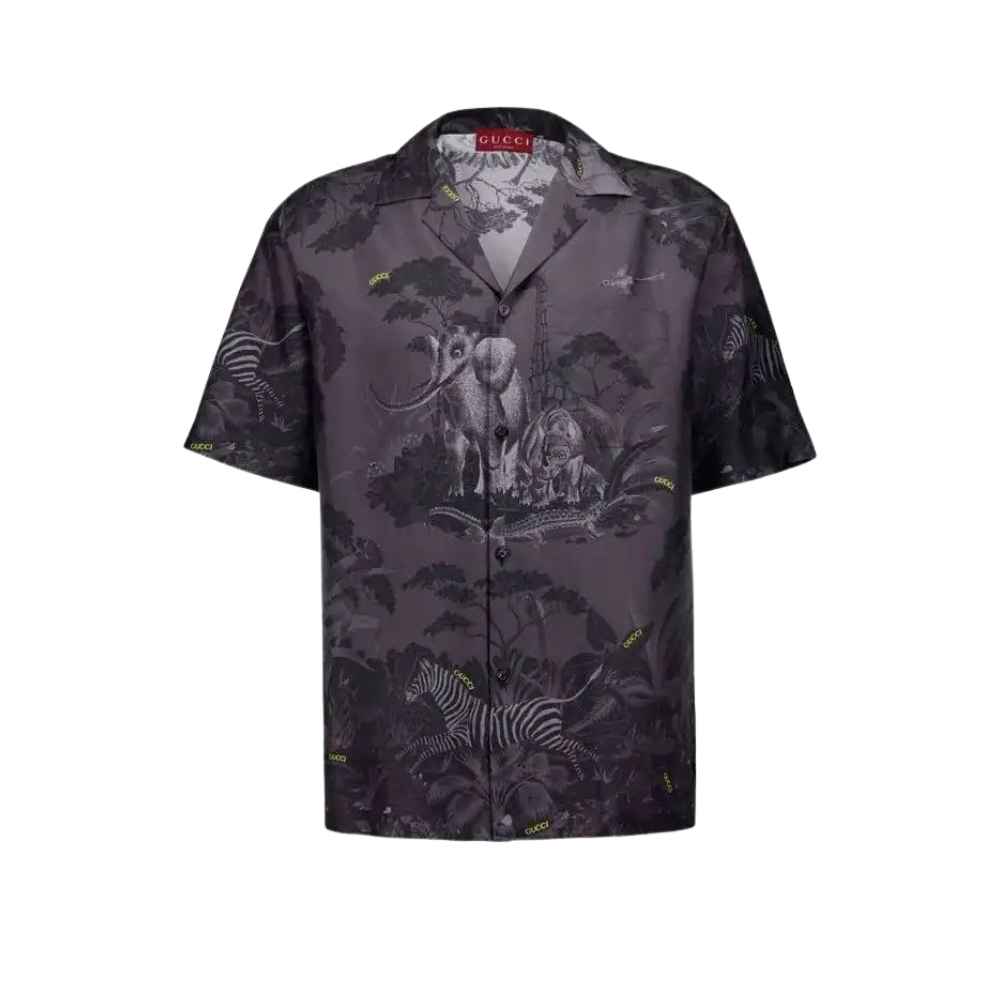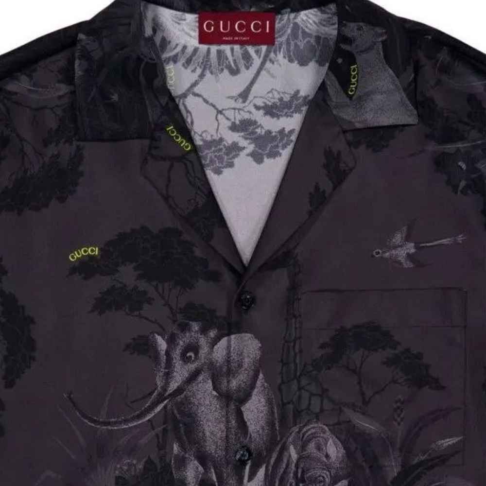 Gucci Flora and Fauna Print Silk Shirt – A premium silk essential featuring a detailed monochrome nature graphic and a relaxed camp collar for an elevated luxury look.