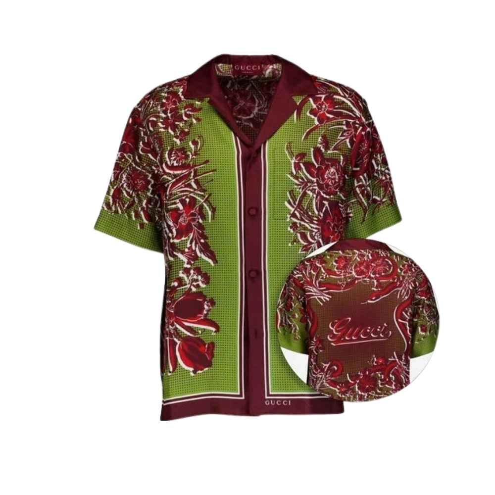 Gucci Floral Print Silk Shirt – A premium silk essential featuring a vibrant botanical graphic and a relaxed camp collar for an elevated luxury look.