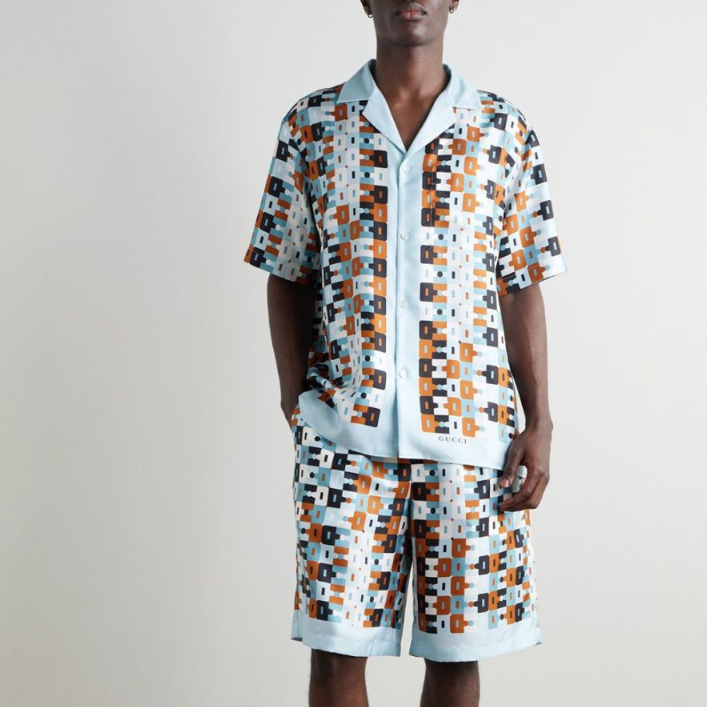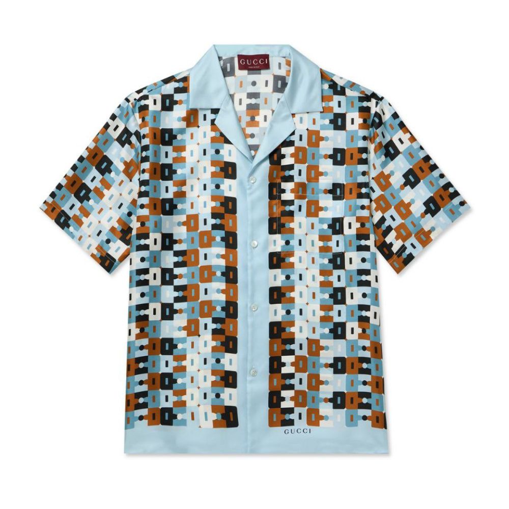 Gucci Geometric Horsebit Silk Camp Collar Shirt – Italian-made silk shirt featuring a signature Horsebit-inspired geometric print and relaxed silhouette.
