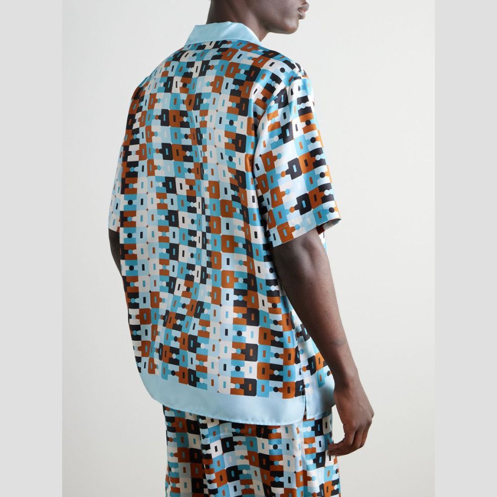 The Gucci Geometric Horsebit Camp Collar Shirt is made from luxurious silk and printed with a refined geometric pattern inspired by the iconic Horsebit motif. It features a relaxed camp collar and fluid drape that creates an effortless yet polished look.