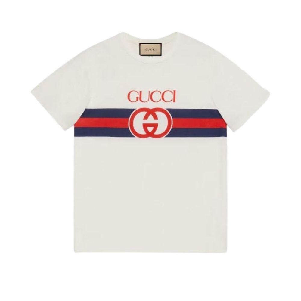 Gucci Interlocking G Web Stripe T-Shirt – A heritage-inspired luxury staple featuring an off-white cotton base, the iconic navy and red Web stripe, and archival branding.