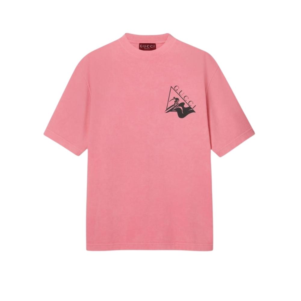 Gucci Printed Cotton T-Shirt Pink – Italian-made luxury tee featuring the iconic Gucci logo on soft pink cotton for a stylish and modern casual look.