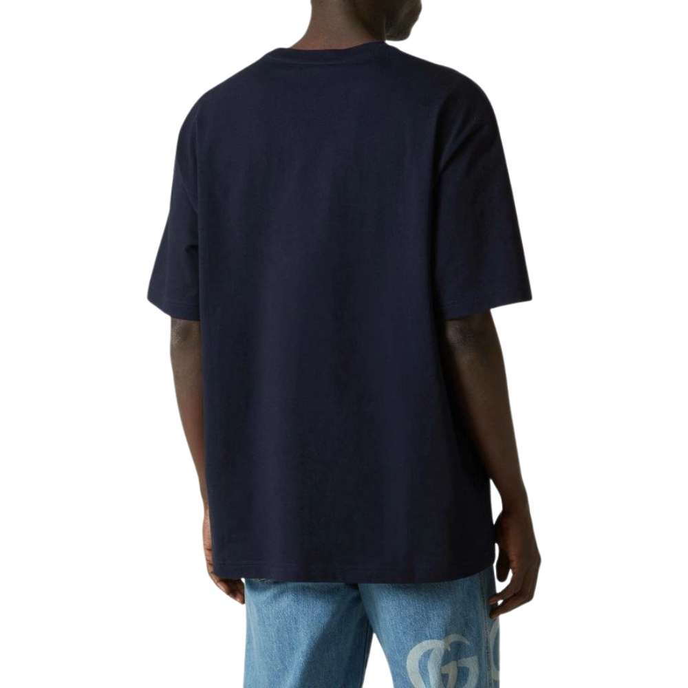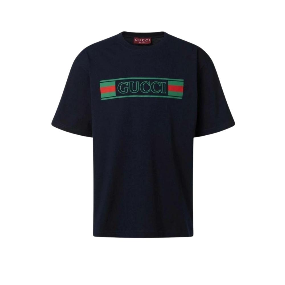 Gucci Web Stripe Logo T-Shirt – A signature luxury essential featuring navy blue premium cotton, the iconic house Web stripe, and a relaxed Italian-tailored silhouette.