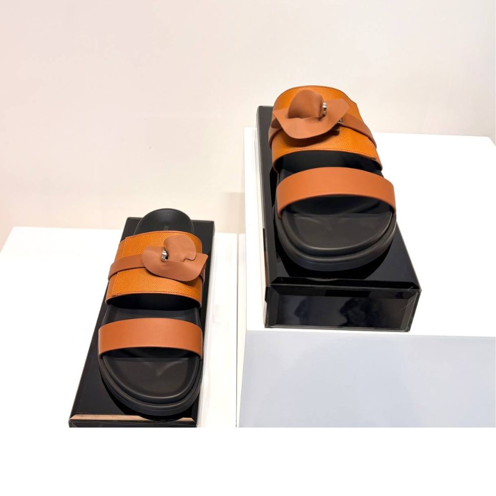 Hermes Designer Leather Slides – PREMIUM TAN LEATHER SLIPPERS with dual straps and a stylish petal accent. Features cushioned sole for comfort and slip-resistant base for everyday luxury wear.