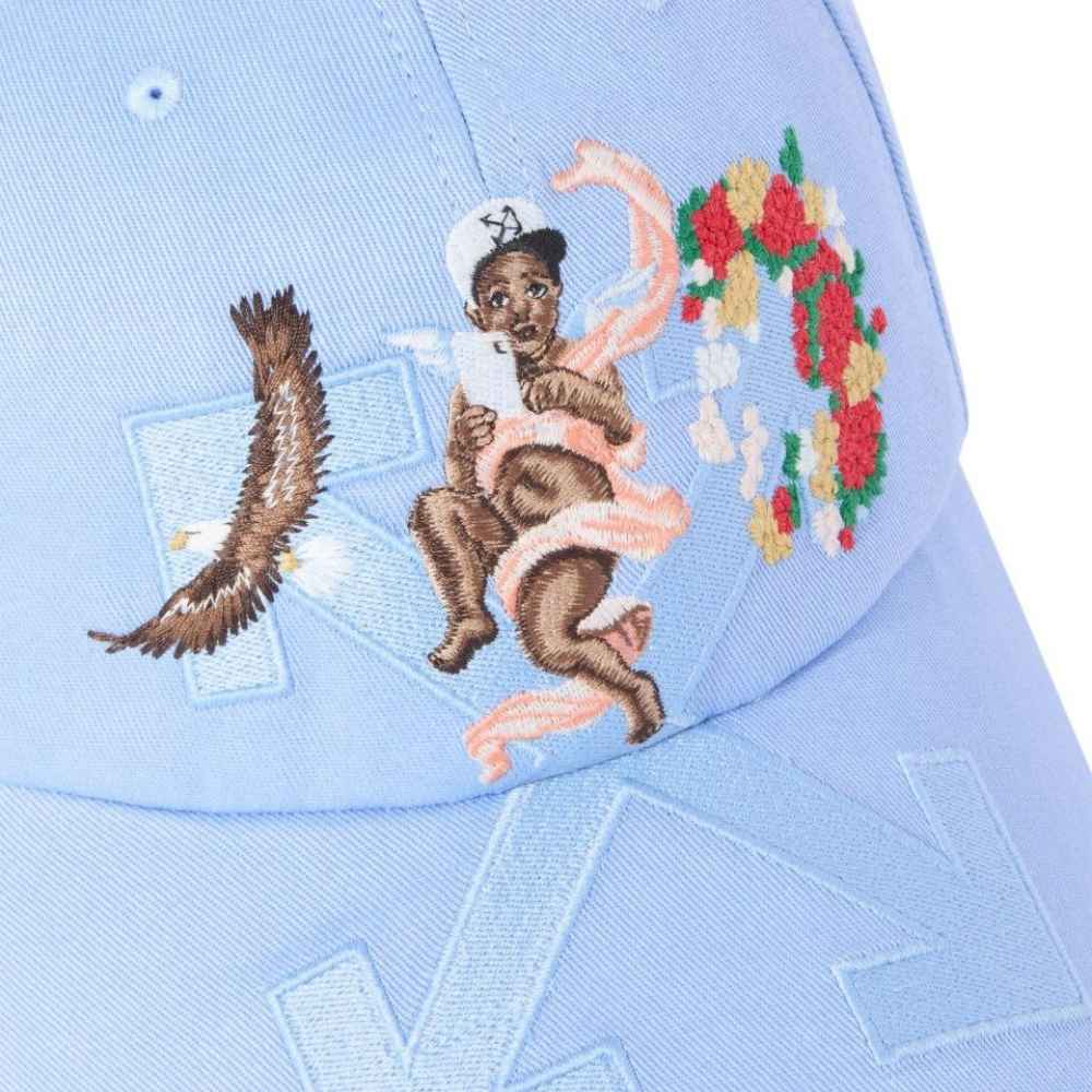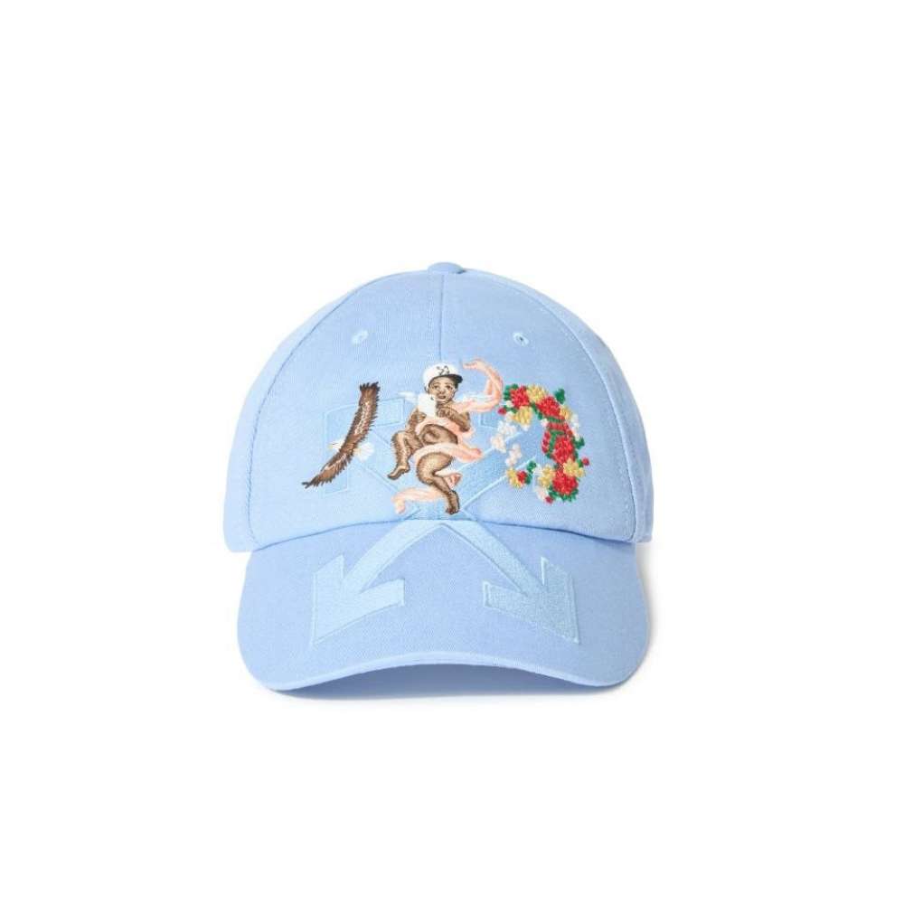 Off-White Blue Fresco Arrow Cap – A luxury streetwear staple featuring artistic Renaissance embroidery, the iconic Arrow logo, and premium Italian cotton.