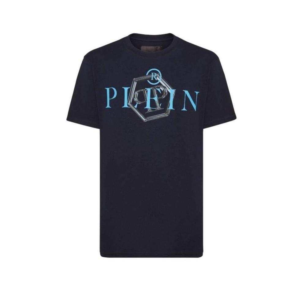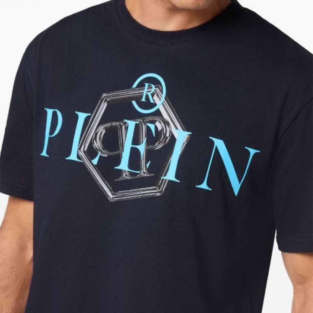 Philipp Plein SS TM T-Shirt – A bold luxury staple featuring premium navy cotton, light blue hexagonal branding, and a signature high-fashion streetwear fit.