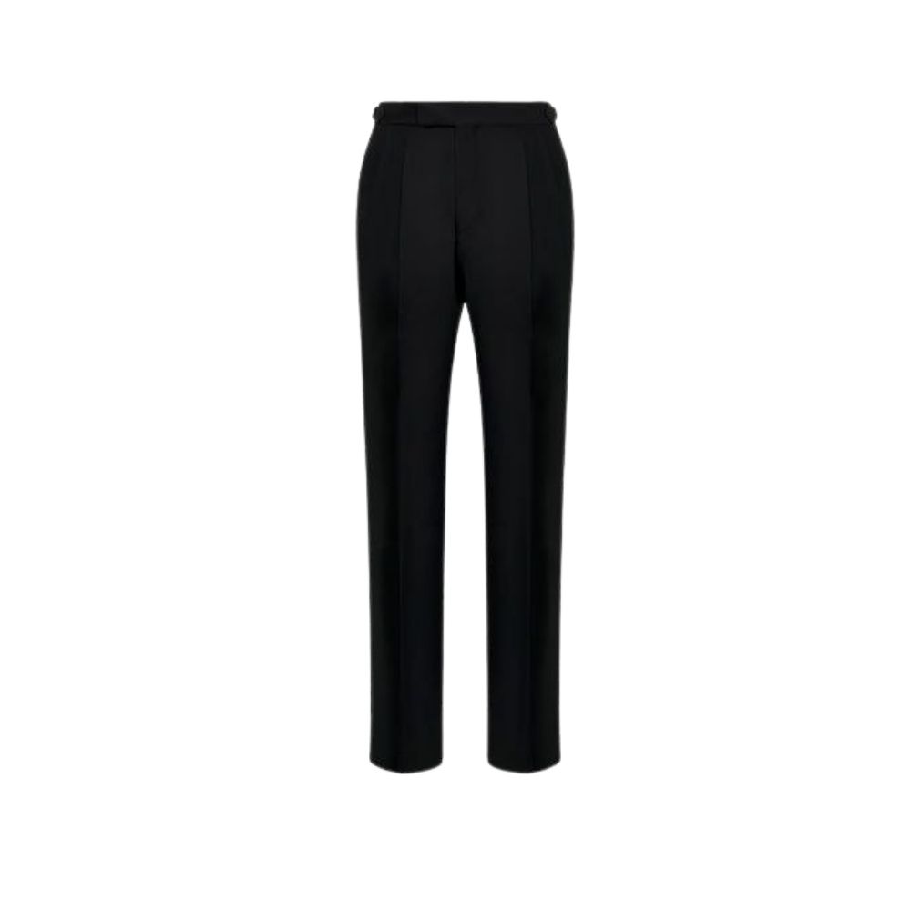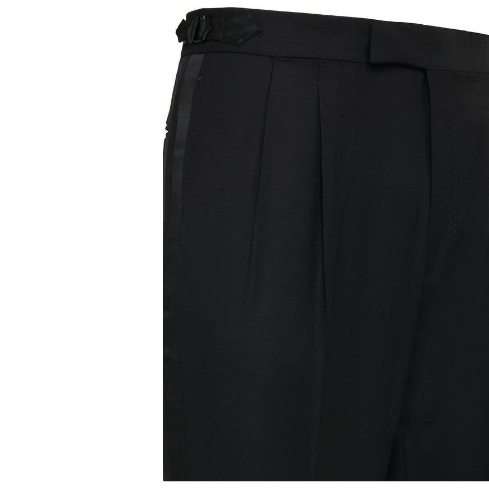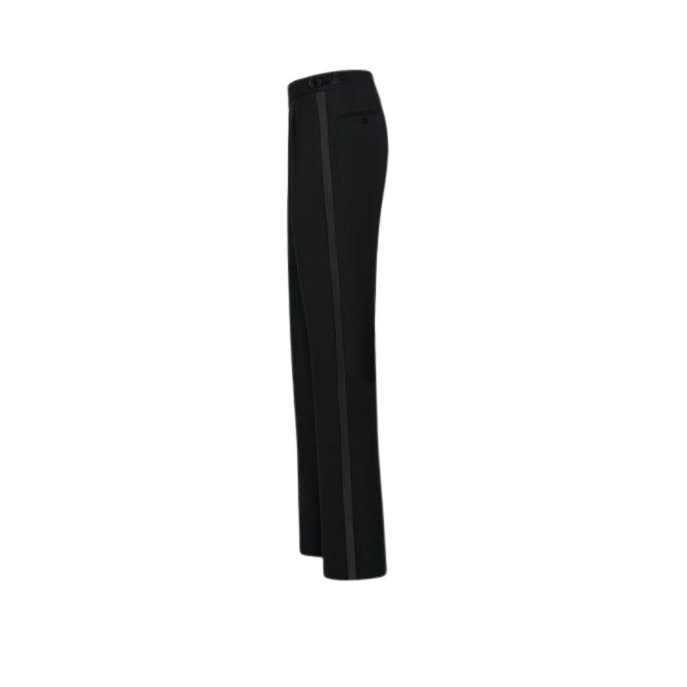 These sophisticated trousers are meticulously crafted from premium high-twist virgin wool, offering a crisp and durable finish with a natural resistance to creasing. The design is centered around a refined tuxedo aesthetic, featuring a clean, flat-front construction that serves as a hallmark of the brand’s formal prestige collection. Expertly tailored with a sleek slim-straight silhouette and sharp pressed creases, these trousers reflect a commitment to timeless sartorial precision and modern elegance. The deep midnight black palette provides a versatile and commanding foundation, complemented by a seamless waistband and discreet side-adjusters for a bespoke, belt-free technical statement. The design is finished with tonal silk-satin piping along the side seams, embodying the perfect fusion of traditional black-tie heritage and contemporary luxury evening wear.