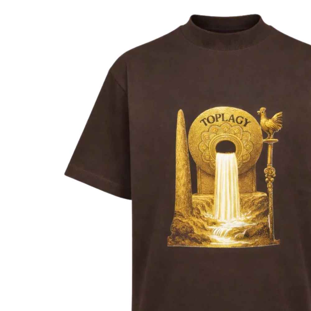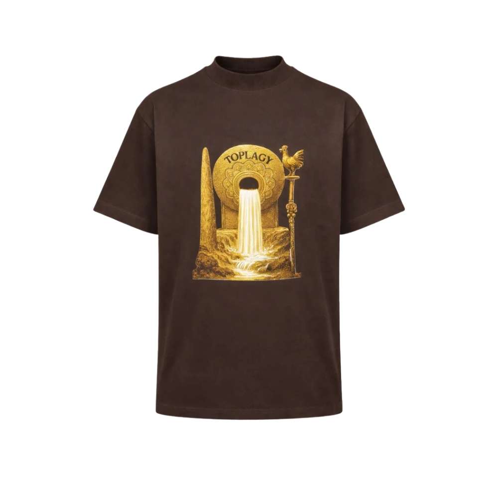 Toplagy Living Spring Oversize Shirt – A premium brown cotton essential featuring an artistic waterfall graphic and a bold collegiate-style logo for a modern streetwear look.