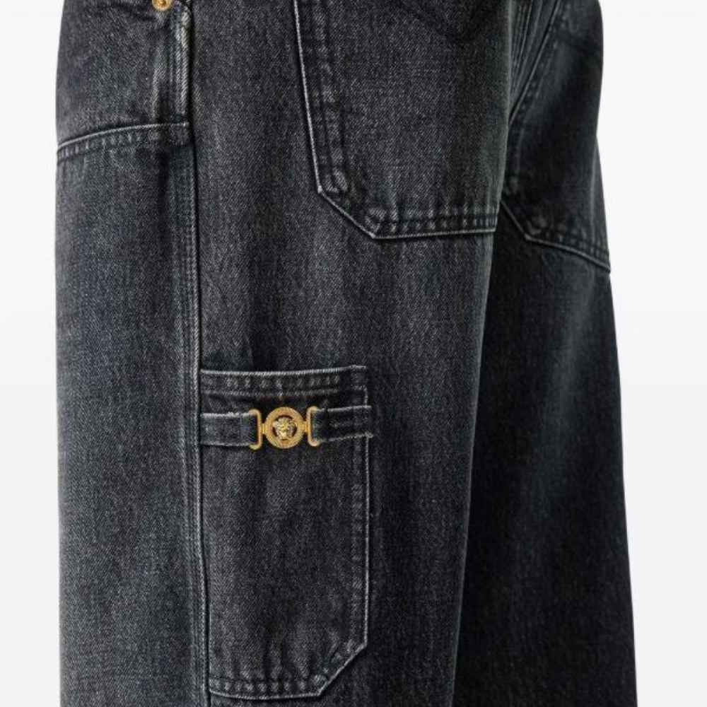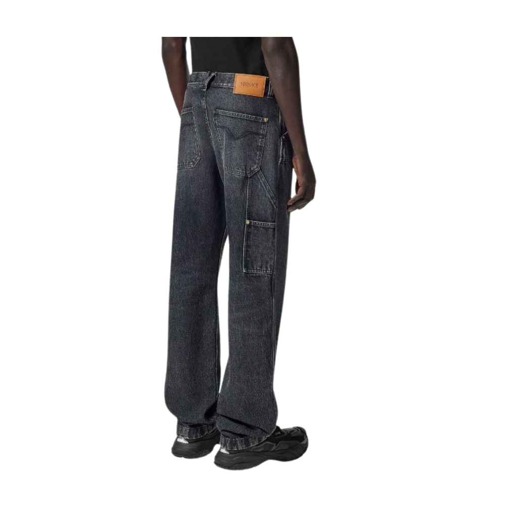 Versace Carpenter Jeans – Italian-made straight-leg denim jeans with cargo details, stone-washed finish, and signature Medusa hardware for a refined blend of utility and luxury.