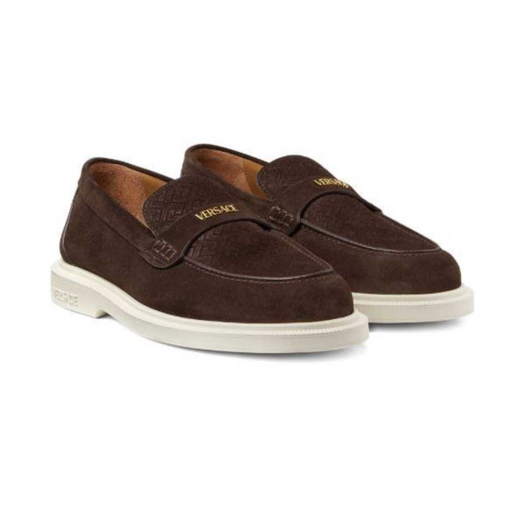Versace Giuliano Suede Loafers – Elegant Italian-made loafers crafted from premium calf suede and detailed with signature gold-tone Medusa hardware.