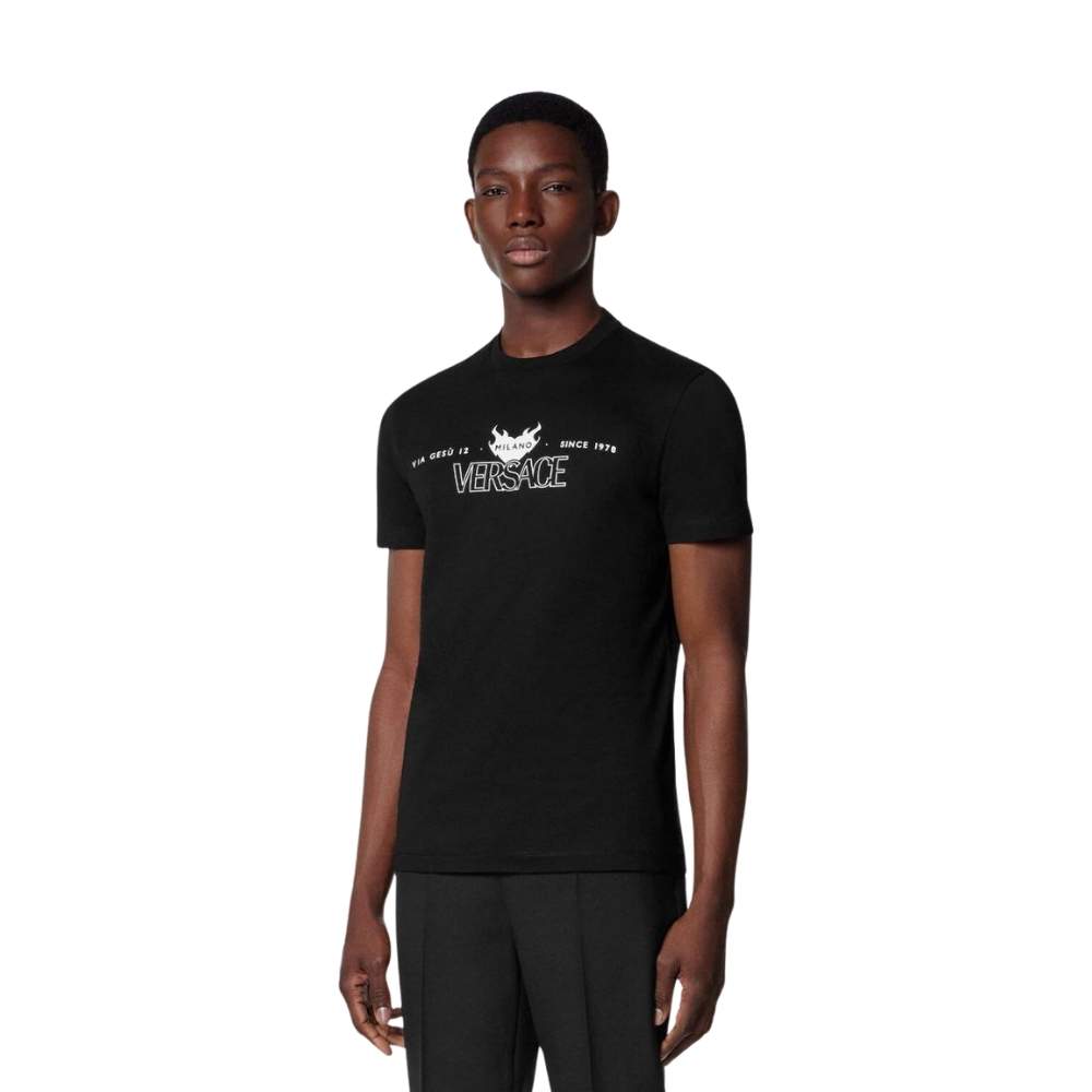 This t-shirt is crafted from premium soft-touch cotton jersey providing a high-quality feel and exceptional breathability for elevated daily wear. It features a minimalist white graphic on the chest showcasing the “VERSACE” logo alongside the brand’s historic Via Gesù 12 Milano address. The design is tailored with a traditional ribbed crew neckline and a relaxed silhouette to ensure a contemporary and versatile luxury streetwear look. Expertly manufactured with meticulous attention to detail this piece reflects the house’s dedication to clean visual storytelling and timeless prestige. It offers a high-impact sophisticated aesthetic that pairs effortlessly with premium denim or tailored joggers for a refined off-duty ensemble.