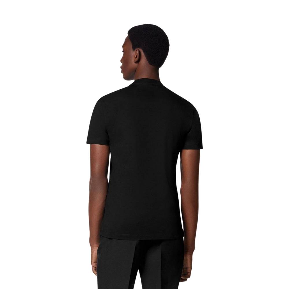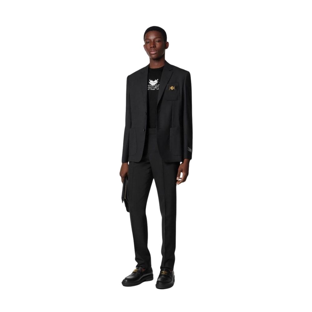 Versace Milano Heritage T-Shirt – A sleek luxury staple featuring a deep black cotton base and a sophisticated white script honoring the house’s Milanese roots.