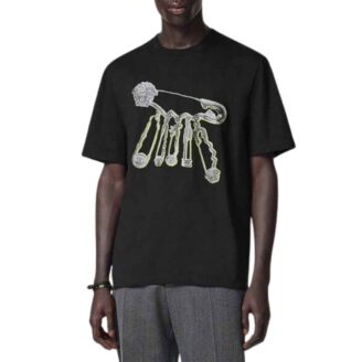 Versace Safety Pin Graphic T-Shirt – A bold luxury staple featuring a deep black cotton base and an iconic silver-tone safety pin and Medusa head graphic.