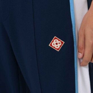 Casablanca Textured Jersey Trousers – A sophisticated take on classic track pants featuring vibrant side stripes and the house’s iconic diamond emblem.